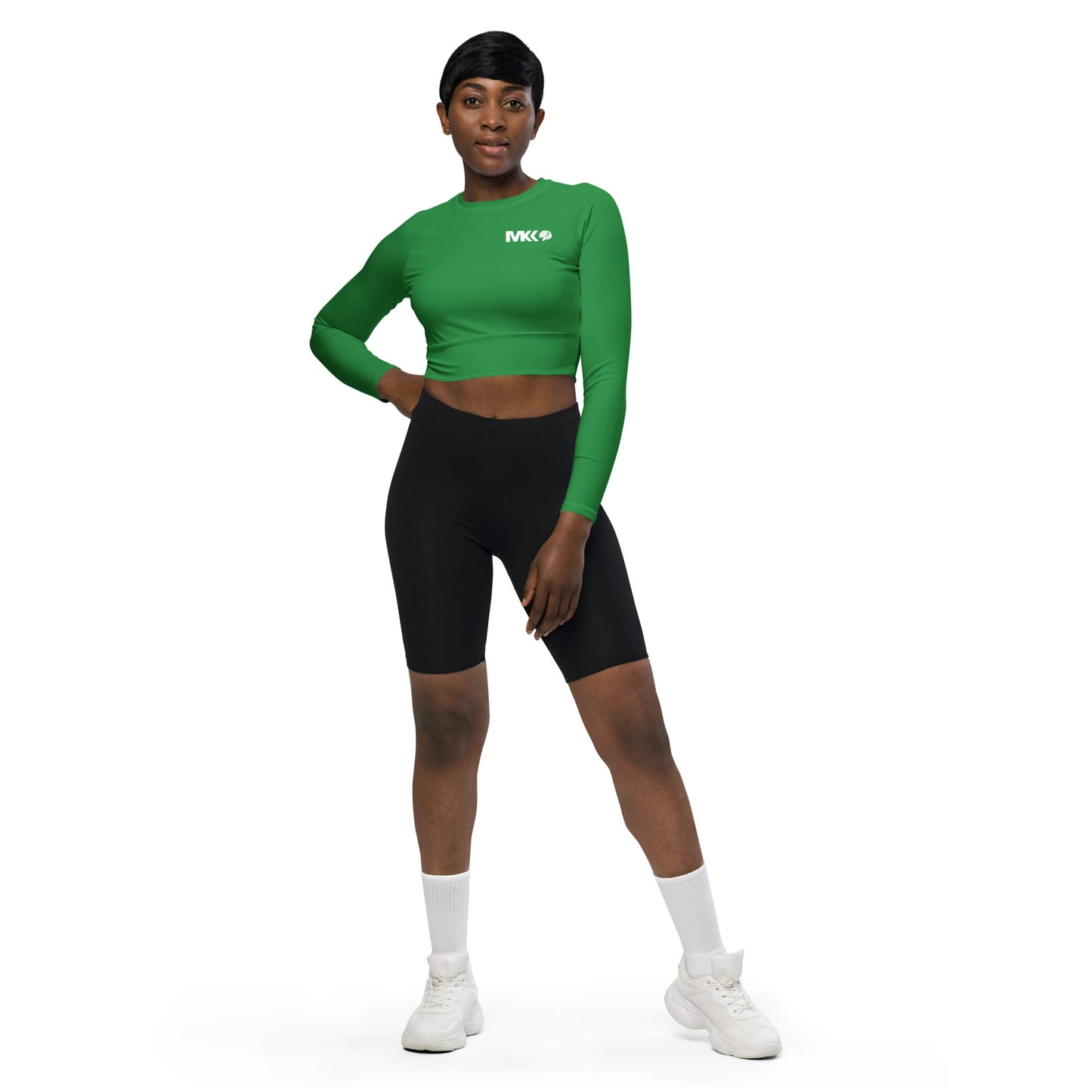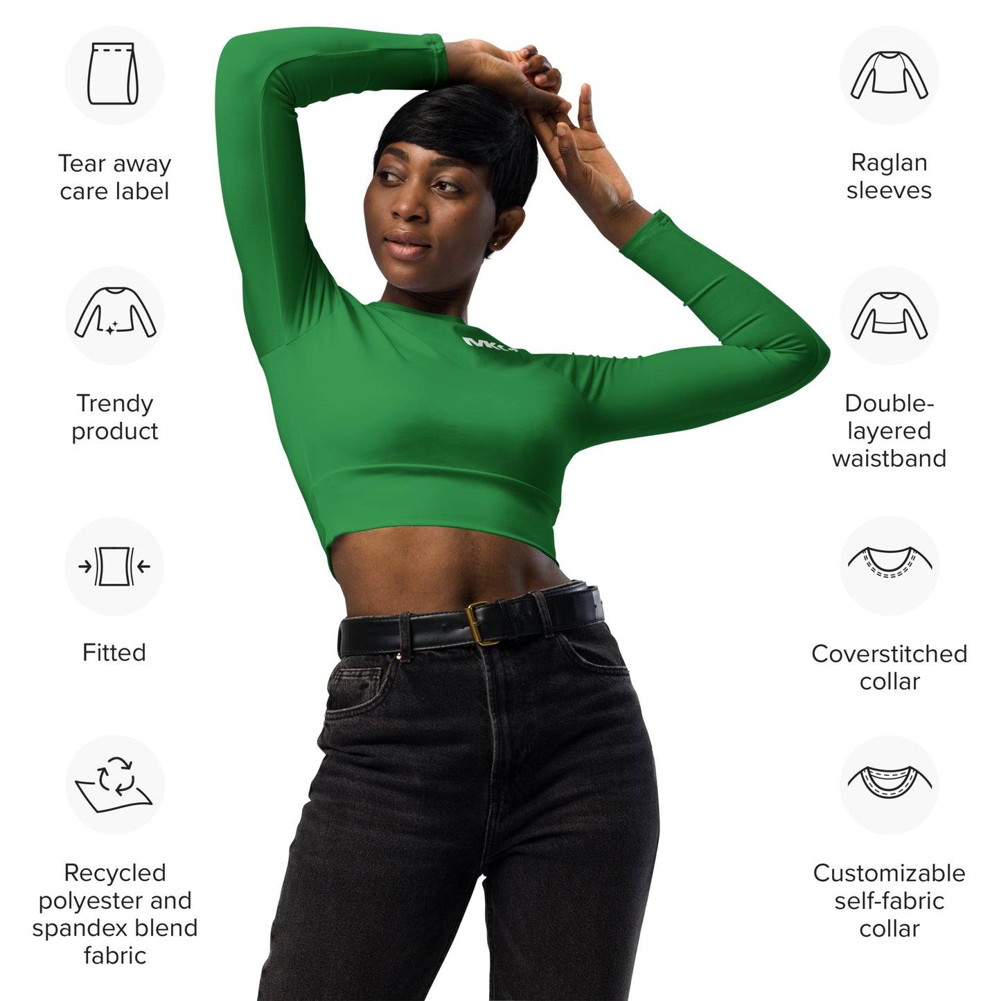 This long-sleeve crop top is made of recycled polyester and elastane, making it an eco-friendly choice for swimming, sports, or athleisure outfits. The crop top has a tear-away care label and a wide, double-layered waistline band for a comfortable fit.