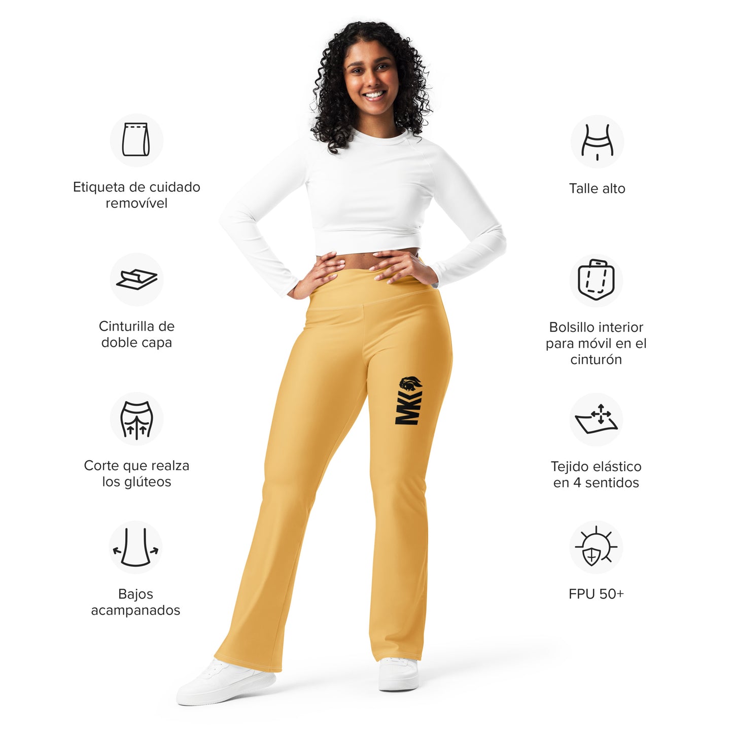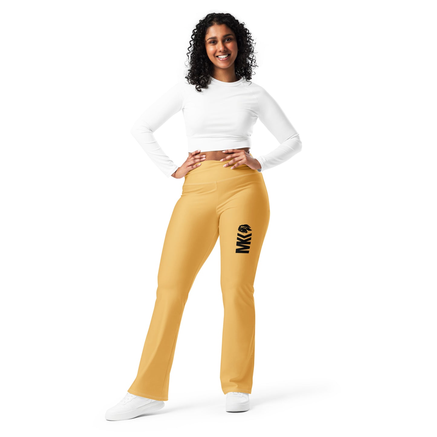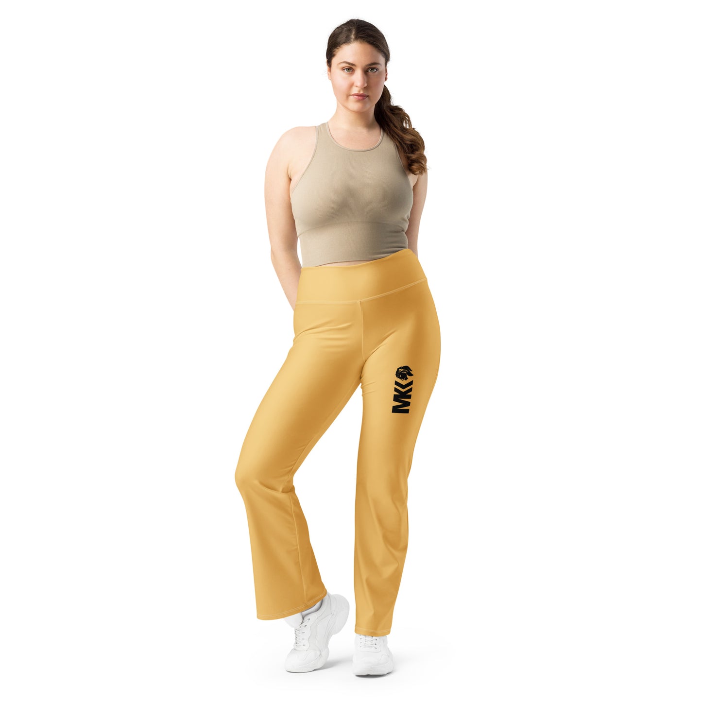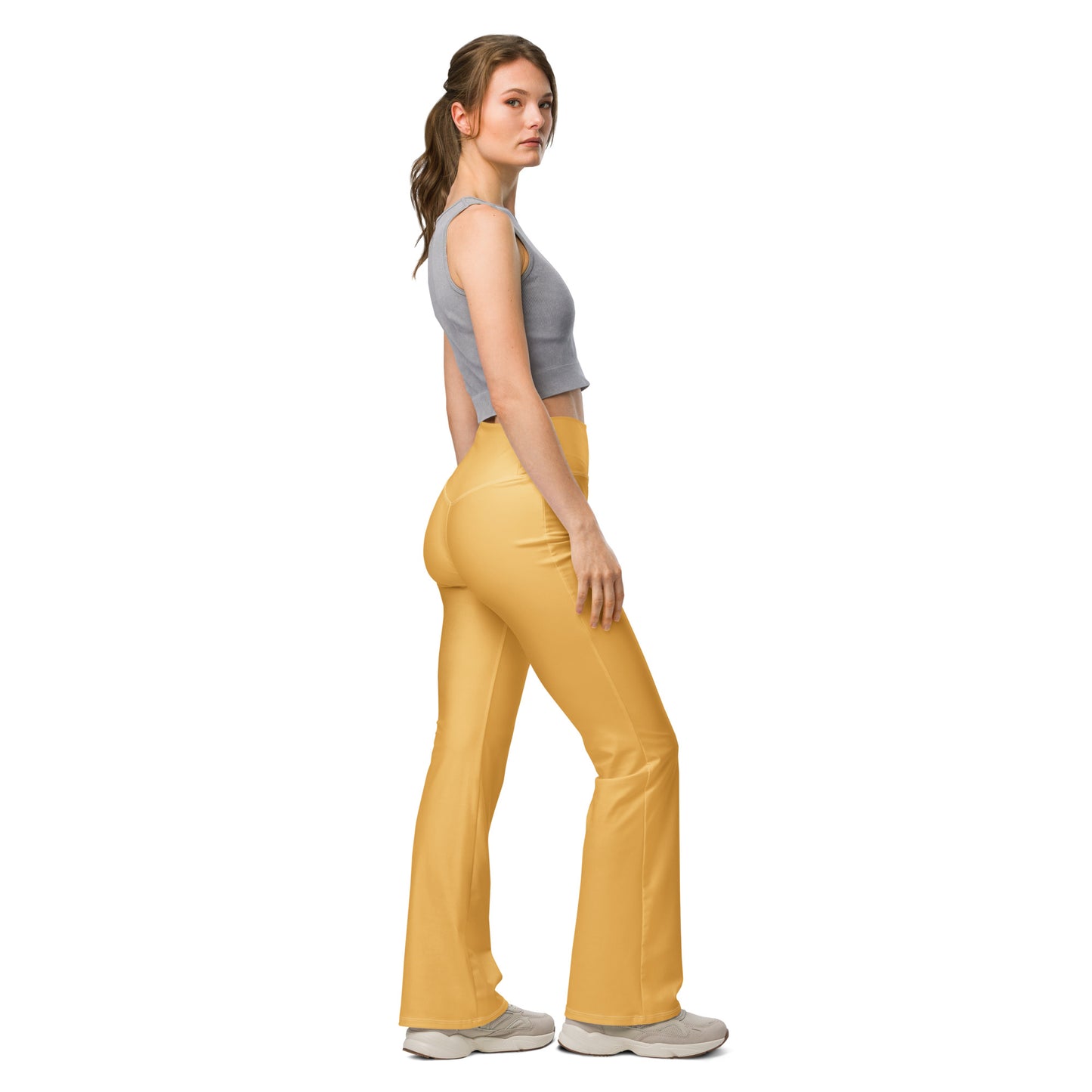 Designed to enhance your figure, these trendy leggings feature a high waist and a butt-lifting cut. The flared leg bottoms add a touch of style and make the leggings comfortable. Wear them on a walk, to the gym, or style them up with a bomber jacket or hoodie.